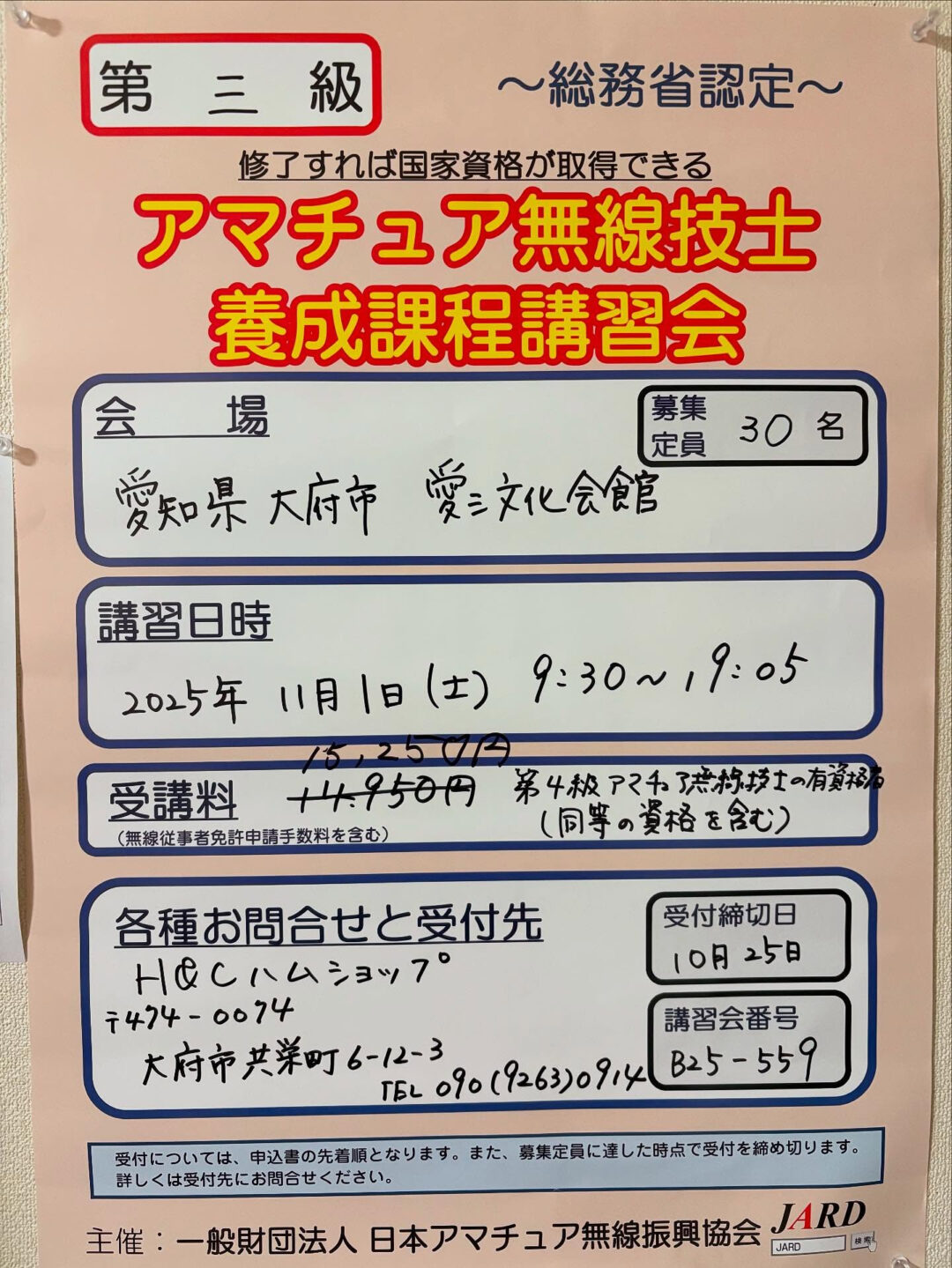 国家資格の第三級アマチュア無線技士講習会が愛知県大府市の愛三文化会館で開催します。ネット申し込みを10月22日まで可能です。最終申し期限は、10月25日紙書類到着まで可能です。是非この機会にお申込みください。3アマは、全アマチュア無線家の20%の方しか持っていない資格で、モールス通信と50Wまでの電波を出すことができ、海外まで電波が到着する上級資格ですが、講習会で1日で受講可能です。ただし、4アマ相当資格取得者しか受講できません。https://e-ln.jard.or.jp/jard_internet_reception/public/front/regist-email/index/kousyukaino/B25559