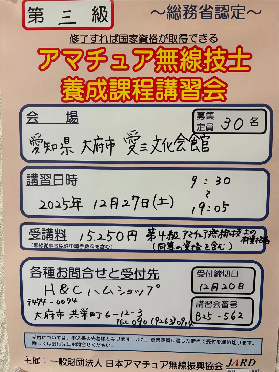 12月27日土曜日に愛知県大府市の愛三文化会館で第三級アマチュア無線技士講習会を開催します。3アマは、全アマチュアの20%しかいない上級の資格です。モールス通信が出来る事と、送信出力が50Wと高出力で海外まで電波が届きます.但し、4アマ相当の資格がないと